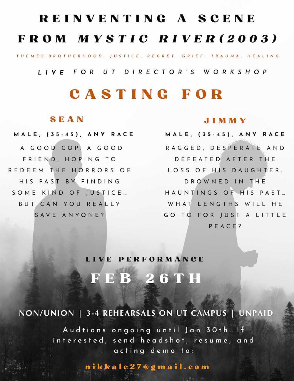 A stage reinvention of a scene from Mystic River (2003), exploring themes of brotherhood, trauma, grief, and justice. This scene will be performed live in Austin for fellow UT student filmmakers and faculty professionals, all of whom will be directing, casting, or producing films on an ongoing basis for the next few years.