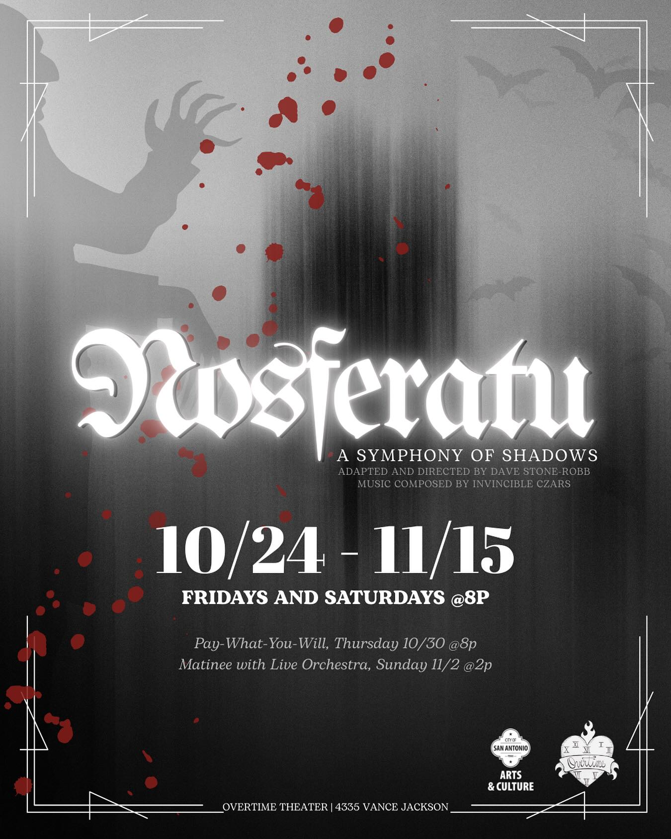 NOSFERATU adapted and directed by Dave Stone-Robb will take over our main stage next month opening 10/24. With original music by the Invincible Czars and Dave’s vision, this retelling of a classic story is exactly what we need this spooky season. Tickets on sale soon. We can’t wait to invite you in.