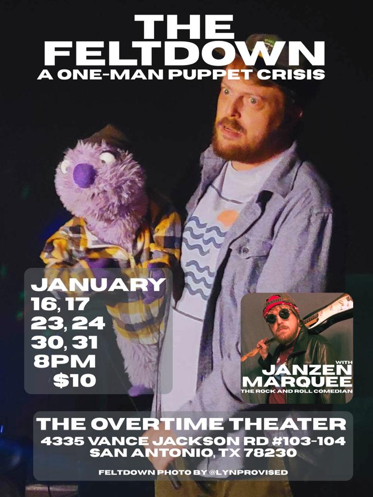 Jason VanSlycke has been performing comedy for twenty years. He trained at Coldtowne Theater and Bexar Stage. He is a contributing writer for The Hard Times. His sketch team, The Big Toe Sketch Show, has performed at Chicago's iO fest in 2024 and 2025. The Feltdown has also been workshopped across several stages in San Antonio as well as the Pack Theater and Elysian in Los Angeles.
