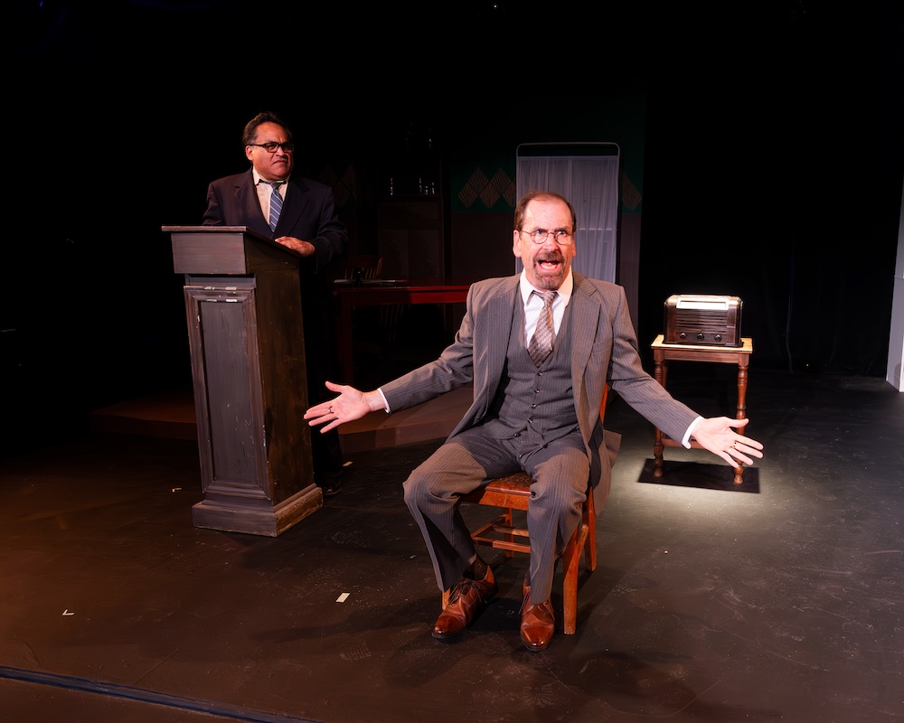 Some of the production problems held the audience back from exploring the insights of the play. Most could be ignored, but some require mention, or there’s no growth. The set looked like it cost twelve dollars and fifty cents and was brought in under budget on the morning of the opening. The upstage wall house left bore a painted stencil pattern intended to evoke wallpaper patterns of the 1920s. The spacings of the stencils varied, and two stencils touched at their edges, completely out of spacing. The bottom row (about hip height—was the painting unfinished?) angled down toward center stage, off-horizontal. The upstage wall house right was finished so poorly that the plywood panels could be seen along their joins. Meant to represent an interior wall of a doctor’s domestic apartment , they looked like a plywood shack. That part of the stage lacked , for example, any framed cozy vernacular paintings to express domesticity and set the apartment apart visually from the office and clinic sets at house center and house left. The lighting design to set off the scenes needed help to make clear changes. Carpets would have helped, but all the audience got was bare concrete floors, out-of-period chairs, and platforms more mid-century than 1920s. The central radio, however, was great.