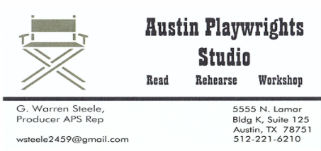 Auditions for a role in Was He Anyone? with APS Rep on Jan 30 through Feb 04.Playwright and Director G. Warren Steele (AEA) continues to hold auditions for a new company (APS Rep) which will operate out of his rehearsal/workshop space, Austin Playwrights Studio. The auditions will take place at the Studio, 5555 N. Lamar Blvd., Bldg K, Suite 125, on the following dates and times: 7 to 10 on Mon., Jan. 30 and 7 to 9 on Sat., Feb. 4.