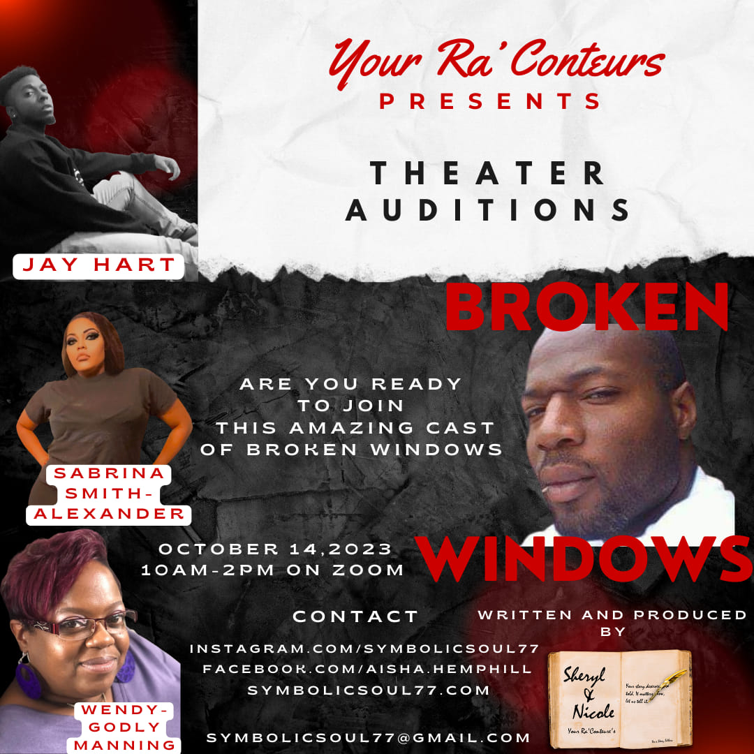 "Broken Windows" is an opportunity to be part of a compelling and impactful production that delves into the human experience. We look forward to seeing your talent and passion at the auditions. For audition appointments and inquiries, please contact symbolicsoul77@gmail.com