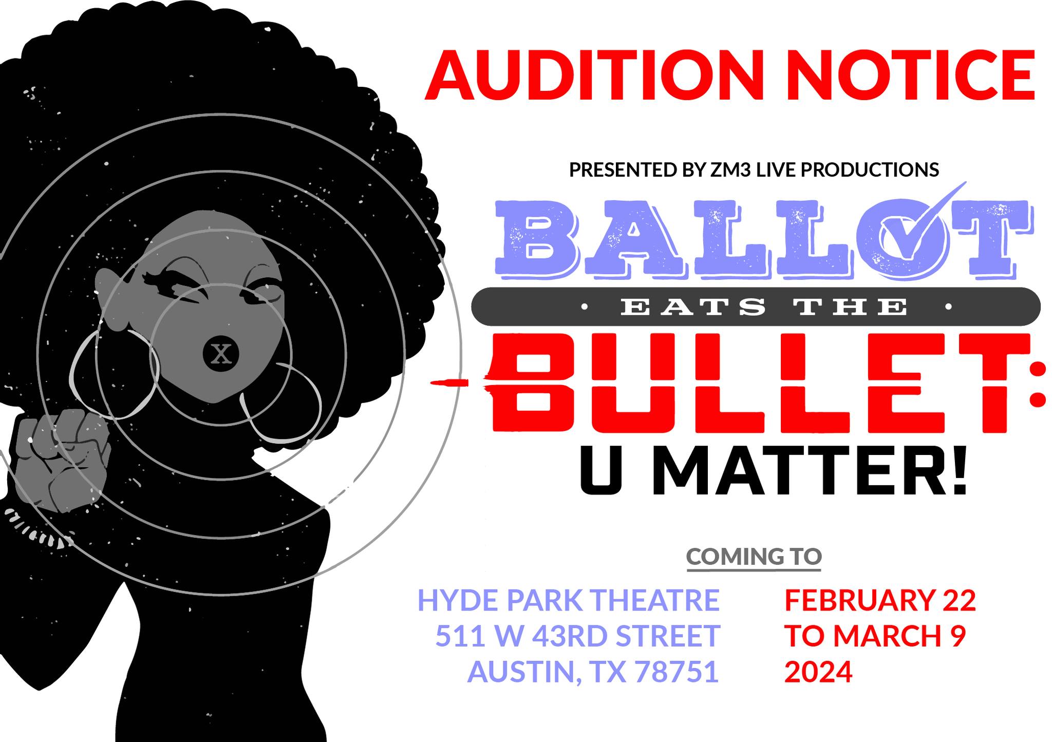 Ballot Eats the Bullet: U matter is written by Austin Hall of Fame Artist Zell Miller, III with contributions from Anne Wynter. The play will be directed by Zell Miller, III.