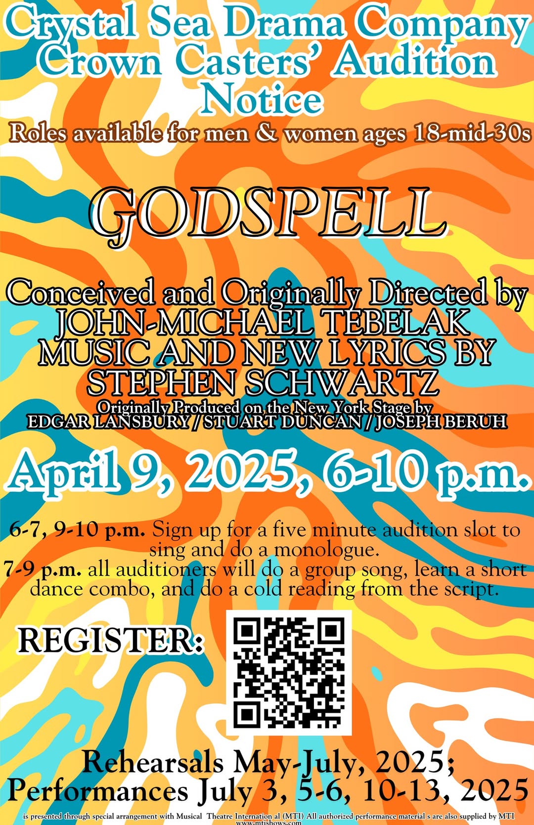 Auditions for a role in Godspell with Crystal Sea Drama Company on Apr 09.Audition Notice - Godspell