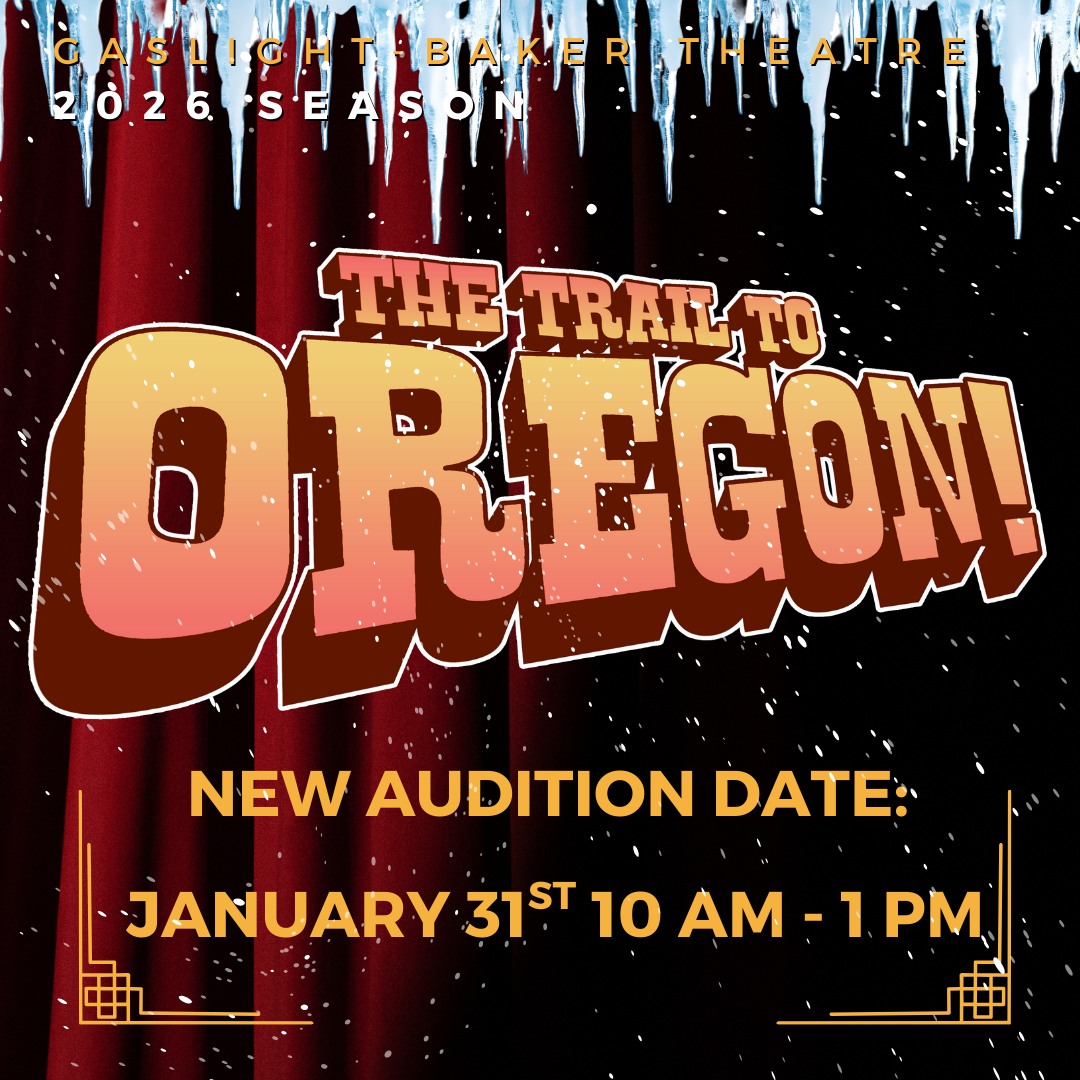 Get ready for musical mayhem, outrageous comedy, and total chaos! Gaslight-Baker Theatre is holding auditions for The Trail to Oregon, a fast-paced, irreverent musical inspired by the classic computer game. This show is loud, ridiculous, heartfelt, and unapologetically theatrical — and we’re looking for performers who aren’t afraid to go BIG.