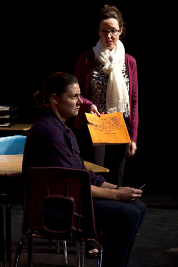 The setting at the Salvage Vanguard's black box is that of a fifth-grade classroom. In contrast to those of many other FronteraFest presentations in this space, the room seems spacious. A long greenboard runs across the rear. Those two rows of school desks have lots of room between them. Bright images and posters carry optimistic slogans. The kids are gone -- the kids are gone at every moment in this piece, both physically and in …