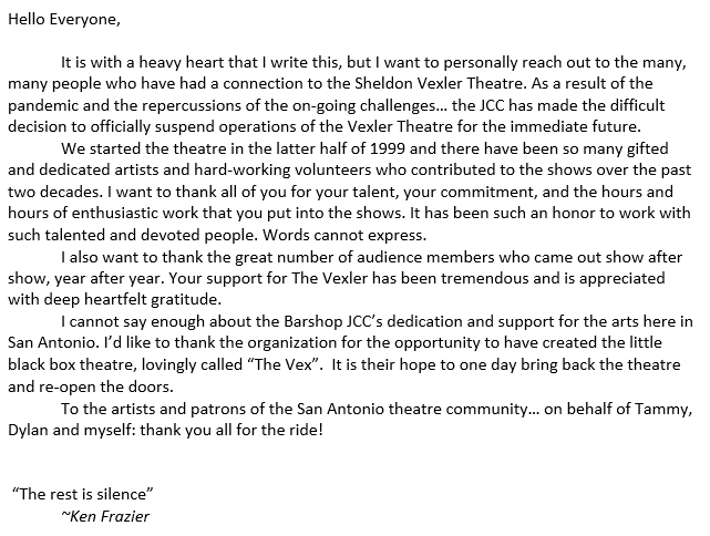 Farewell Message from Ken Frazier, Artistic Director of the Vexler Theatre, San Antonio, Closing Indefinitely