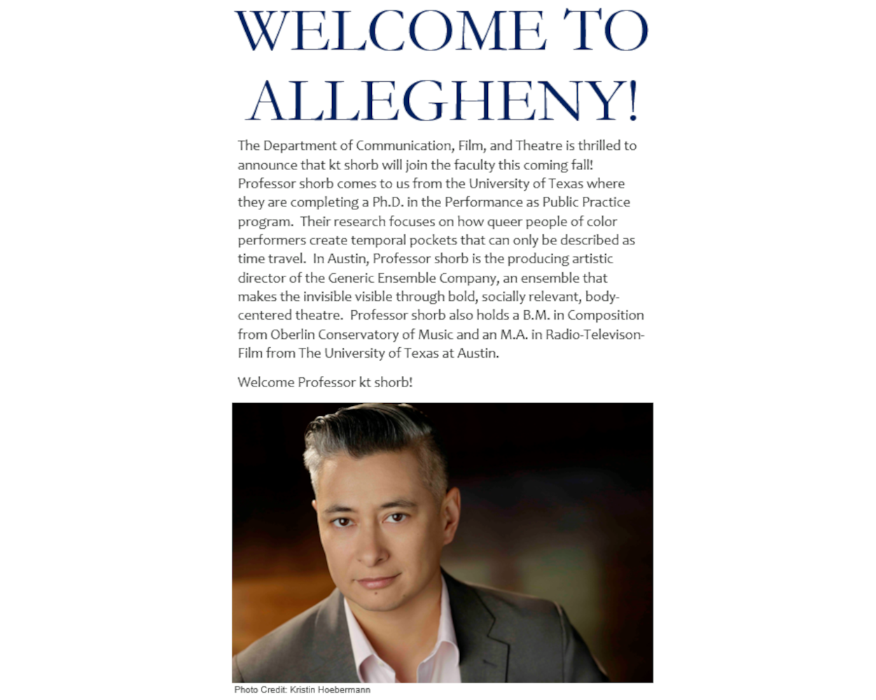 kt shorb, Artistic Director of Generic Ensemble Company, Accepts Position at Allegheny College, Pennsylvania
