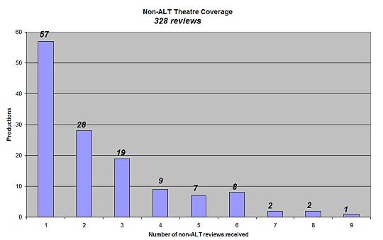 Those reviews were not evenly spread. They ranged from nine reviews for Capital T's production of Killer Joe at the Hyde Park Theatre (which ALT reluctantly panned), to a more typical score for well attended shows of two non-ALT reviews (28 productions) or one non-ALT review (57 productions, although this includes some Short Finge elements of Hyde Park Theatre's 100-item Frontera Fest). More typical, however, was no review at all-- the case for 195 productions, or 59.5 percent of those staged in the greater Austin area.