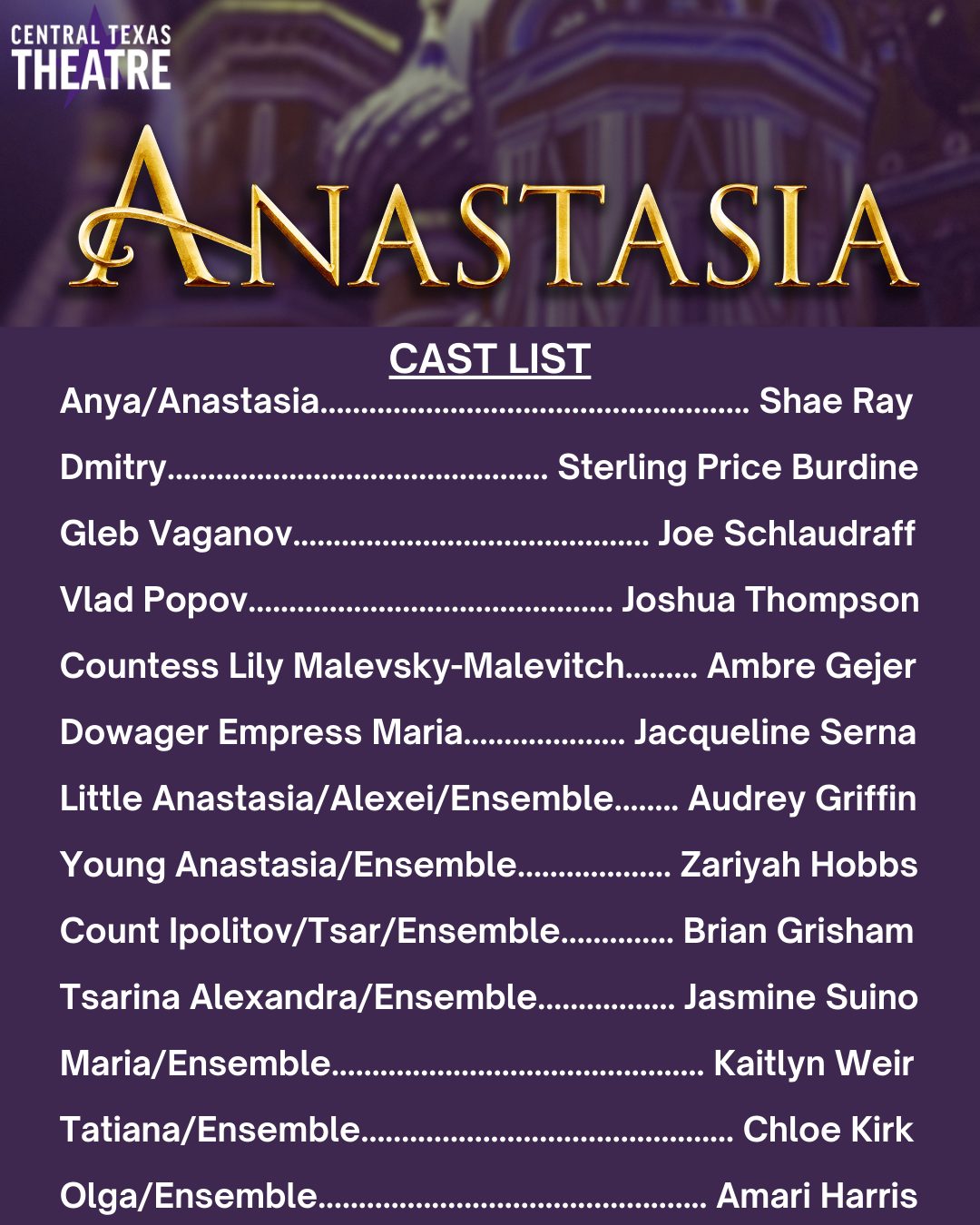 This dazzling show transports you from the twilight of the Russian Empire to the euphoria of Paris in the 1920s, as a brave young woman sets out to discover the mystery of her past. Pursued by a ruthless Soviet officer determined to silence her, Anya enlists the aid of a dashing con man and a lovable ex-aristocrat. Together, they embark on an epic adventure to help her find home, love and family.