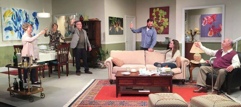 The many funny lines dashed liberally throughout the script were pulled off with perfect comedic timing, but the overall mood was dark and glum, more like the films The Ice Storm or Carnage than Meet the Parents. The brilliant scene design by Desiderio Roybal contributes to this sentiment. The one-scene set of an English living/dining room is replete with all the miscellanea of everyday life: glasses, lamps, linen napkins, bottles, chairs, O’Keefe-like paintings on the wall. The room is cozy, but the many moments of high tension transform it into something eerily claustrophobic. This becomes more evident during the second act as more people fill the space.