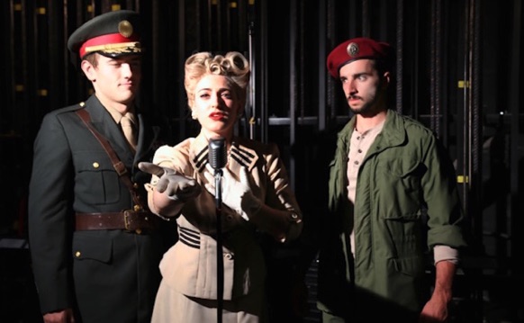 Two minor quibbles: At the second public performance both the opening and closing moments of Evita were hobbled. In the opening scene an old film featuring actress Eva Duarte abruptly stops and the cinema manager steps out to inform the audience, "Eva Peron entered immortality this evening." That's an epic announcement, one that an Argentine might be expected to deliver with the ringing pathos of a funeral oration, but the actor blurted the words and withdrew in haste. The finale seemed similarly marred by abruptness and lack of ceremony. Following a moving death scene and lament, Nardecchia as Che informs us that Evita's tomb was prepared but her body disappeared for 17 years -- and bang, that was it. The fade that followed, though quick, let us see Boissonneault bolting off the balcony in anticipation of a curtain call. It was an end without a conclusion; the audience needed a few seconds at this point to contemplate the story. I've seen another production of Evita use a projected image at that last moment. A Spanish-language production in the Dominican Republic in 2006, steeped in Catholic tradition, even raised a gesturing Evita on high in apparent apotheosis.