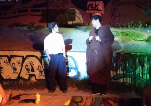 Director Bridget Farias took on an enormous challenge in this production for Last Act Theatre Company (LATCO). She cut and consolidated the piece, working from three translations, reducing it from roughly five hours of stage time to three; when an annoyed resident near the venue wanted to complain to the City about late-night noise, she eliminated another half an hour and moved the start time up to 7 p.m. LATCO, a company of ingenuity, has successfully located non-conventional performing venues all over town, and the Hope Outdoor Gallery is certainly one. It's a collection of half-built structures covered with grafitti, on the hillside just west of Lamar at 11th street. Unexpected changes at the site made impossible Farias's plans to move the audience from place to place with the action, so blocking had to be changed almost at the last minute. And while we're at it: lighting is primitive, run by a generator ineffectually shielded for noise, there's no amplification, and unassociated loiterers with flashlights wander around, about and above the playing space. You have to love LATCO and love the theatre experience to get past so many evident obstacles.