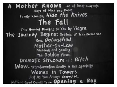 The program contains no list of scenes. That appears, instead, on the back wall of the set, with each cheeky or quirky title additionally announced by a player. The story follows the general outline of the legend as recounted by Apuleius: the goddess Aphrodite (Venus) is offended that the beauty of mortal woman Psyche enchants people so much that they neglect Aphrodite's temple. Working through an oracle, she obliges Psyche's father the king to abandon her on a mountain top, from whence she's spirited away by Zephyr, minor god of the winds. Aphrodite dispatches Eros (Cupid) to make Psyche fall in love with the most hideous monster imaginable; he wounds himself with the magic arrow and is lovestruck for Psyche. Perhaps, just perhaps, he has fulfilled his commission without knowing it. They live for months in their secluded aerie making love, but Eros refuses to give his name and obliges Psyche to remain blindfolded. Envy and fear lead to unmasking and catastrophe.