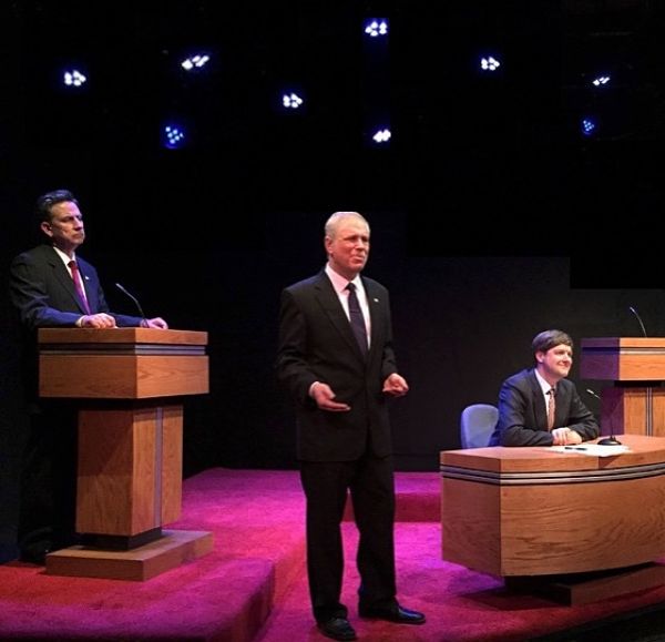 Maher's 2008 piece for Chicago's Theatre Oobleck takes as its point of departure the 2004 presidential election debate in Coral Gables between President George W. Bush and Senator John Kerry. As you file into the theatre, newscaster Jim Lehrer is sitting at the moderator's desk front and center, going over his notes, doing lip exercises, clearing his throat, watching the control booth, counting down intently to the scheduled start of the debate. That's Jason Phelps in a fine touseled wig, and he'll reveal himself shortly in the distinct clipped voice of a tightly controlled newscaster, describing for us and for the watching national audience the rules of engagement -- or rather, the rules of the debate. He announces the participants and we dutifully applaud.